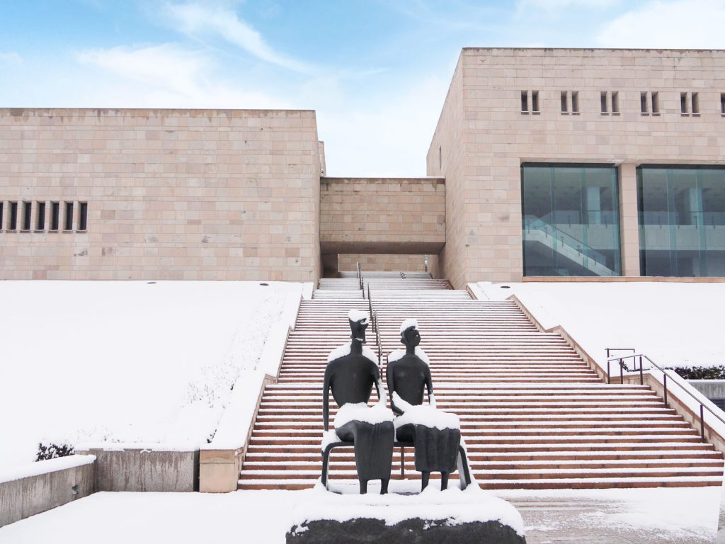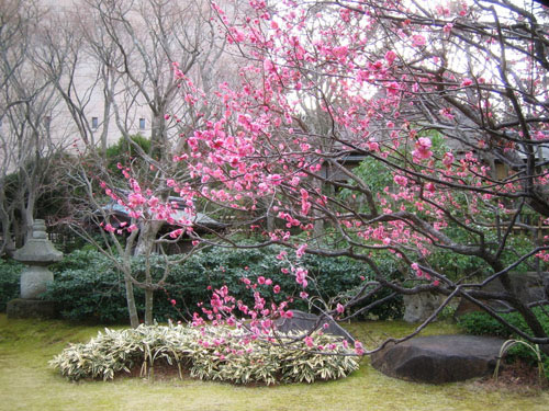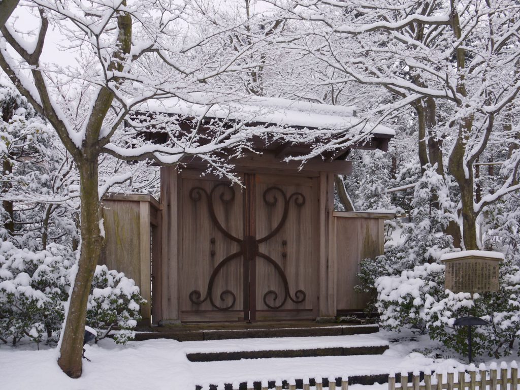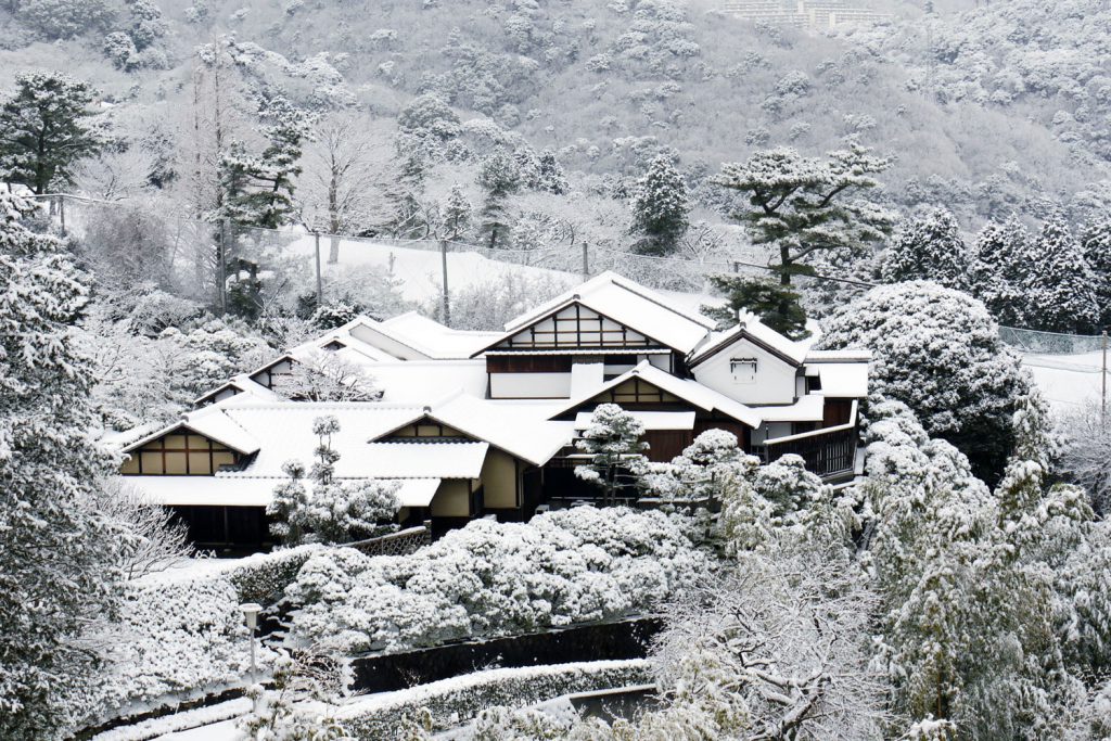 Even in Atami’s mild winter climate, the museum ground, being at an elevation of 250 m, occasionally come under snow. The sight of snow on the tea house and plum branches turns the whole scene into a winter wonderland.