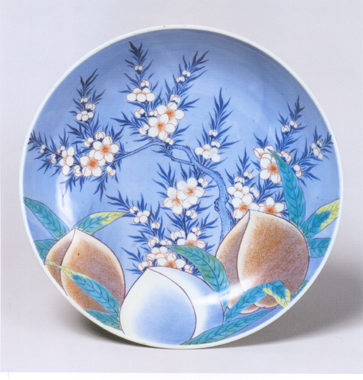 A very deep plate with a high foot, it is finished with a transparent glaze. The peach motif is painted in polychrome overglaze enamels atop the underglaze cobalt blue under painting. Both the design and coloring originated in the polychrome “good-fortune” designs of Ch’ing-dynasty China, but this rendering displays the high level of the Nabeshima technique. Three underglaze blue peony motifs are spaced around the outside of this deep plate, and an embellished interlocking-circle motif decorates the high foot.