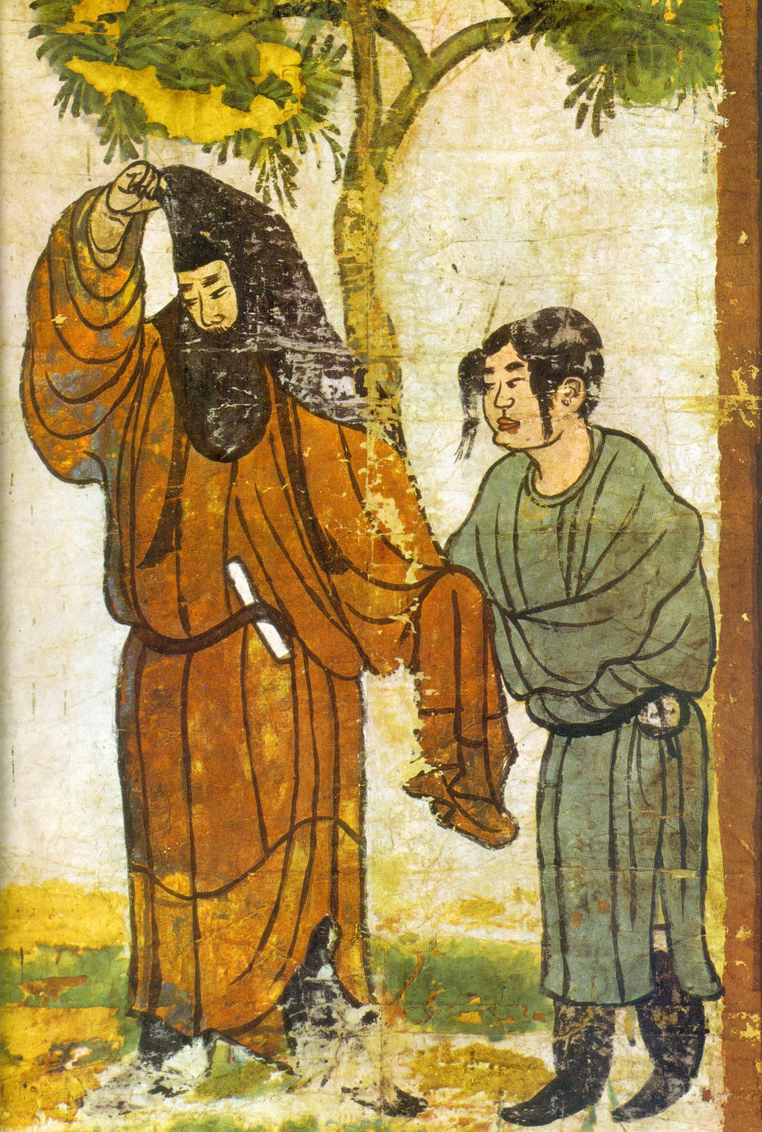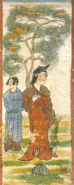 This painting was brought to Japan early in this century by an exploratory party sent to Central Asia by Kozui Otani, chief abbot of the Kyoto temple Nishi Hongan-ji. It is believed to have been excavated in the Turfan district of China.