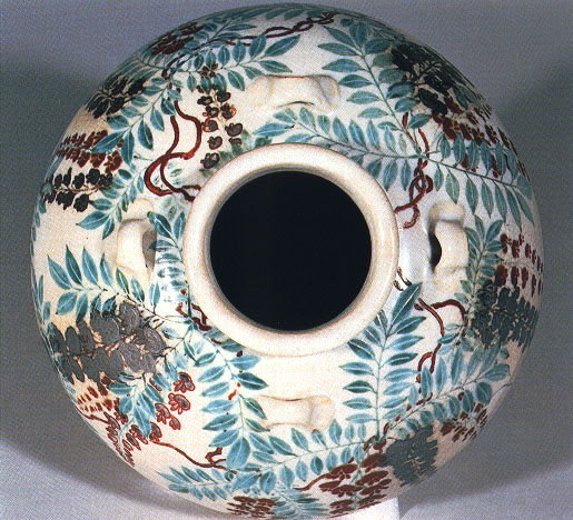This tea-storage jar with four lugs is probably the best work of Nonomura Ninsei (ca. 1574 – 1660). The vessel – known popularly as Fujitsubo, or Wisteria Jar – was made by Nonomura Ninsei, a Kyoto ceramist who was a master of the potter’s wheel. Its full, generous shape and graceful, richly colored wisteria in full bloom, which seem almost to be waving on a slight breeze, make the jar a work without peer. It is a masterpiece embodying the quintessence of Ninsei’s art. Kyoto ware is quite different from the older, imported, rustic tea-storage jars used untill Ninsei’s time, and with its elegance and decorativeness, it clearly reflects the refined culture of the ancient capital of Kyoto.
