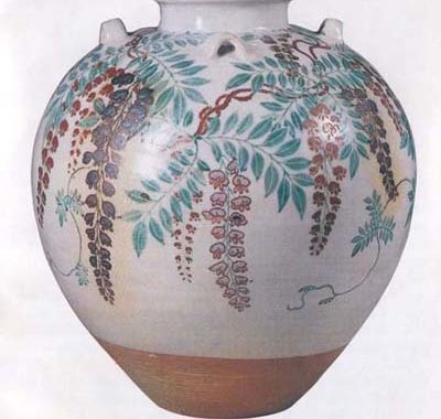 Tea-storage jar with an overglaze enamel design of wisteria, by Nonomura Ninsei