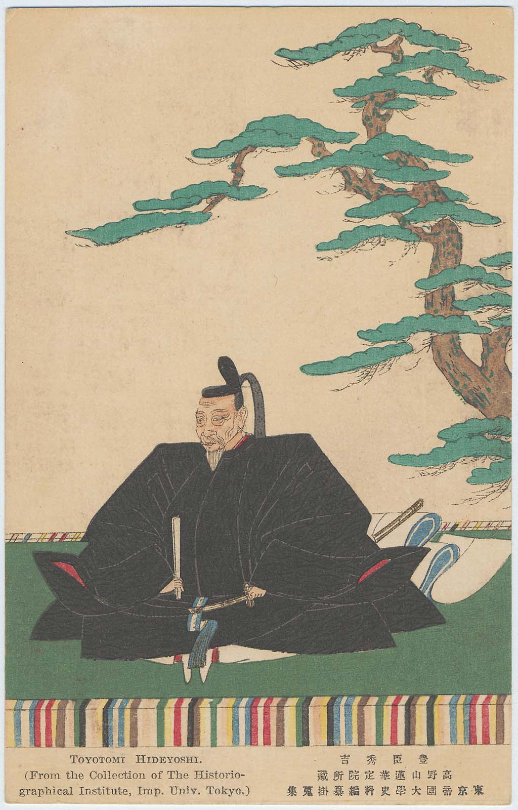 Toyotomi Hideyoshi (豊臣 秀吉, March 17, 1537 – September 18, 1598) was a preeminent daimyō, warrior, general, samurai, and politician of the Sengoku period who is regarded as Japan’s second “great unifier”. He succeeded his former liege lord, Oda Nobunaga, and brought an end to the Sengoku period. The period of his rule is often called the Momoyama period, named after Hideyoshi’s castle. After his death, his young son Hideyori was displaced by Tokugawa Ieyasu.